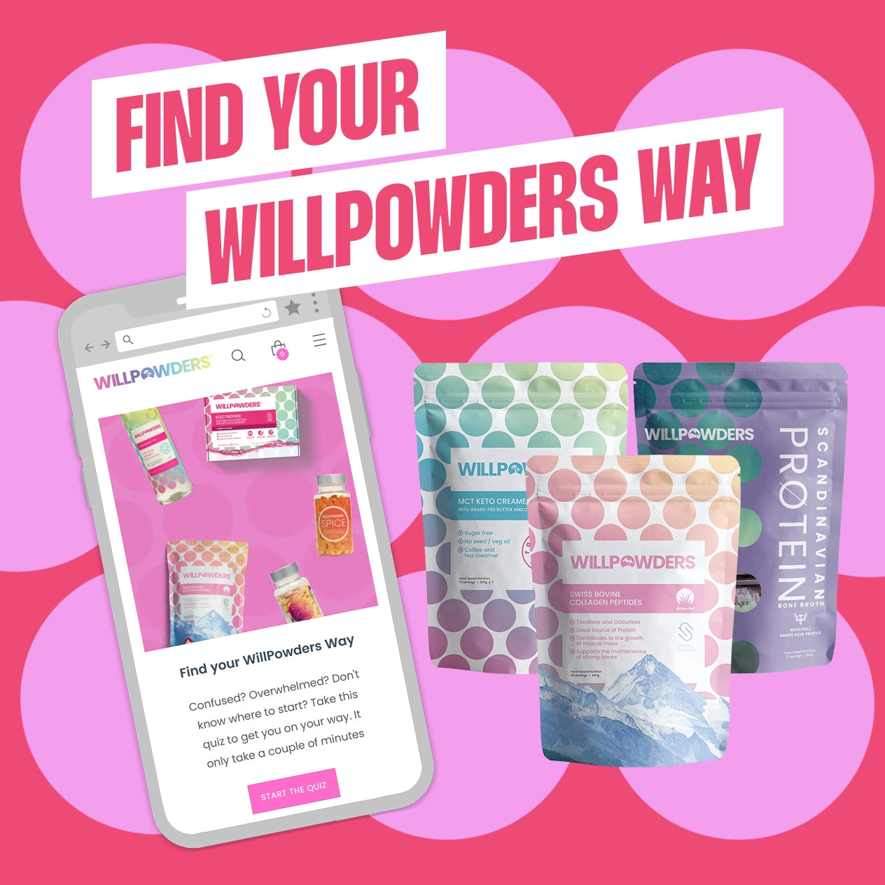 The Health Quiz has been designed to help us find the right products for you. Why? Because finding your WillPowders Way is super personal and everyone's health goals are different.
