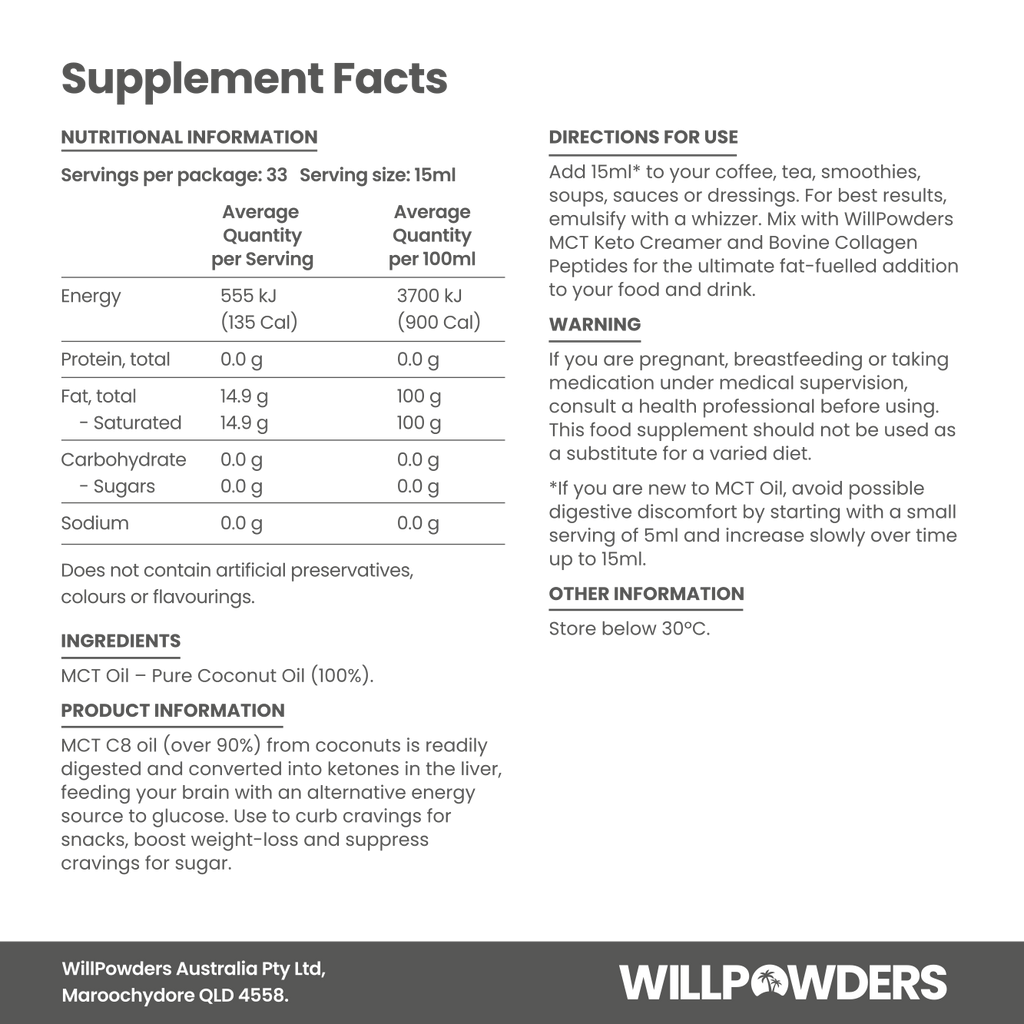 Pure C8 MCT Oil. The shorter the chain, the more fat per molecule, and fat is brain fuel – boom! Your brain is made of around 70% of the stuff, so feed it what it’s craving. WillPowders C8 MCTs convert straight to ketones, delivering clean, lasting energy and focus without the crash.